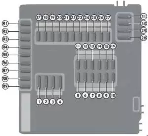 Sensor de microondas; Sensor de lluvia / sensor de luz; Sirena de alarma con sensor de inclinación; Luces de señal de giro a la izquierda, Relé de luz de freno; Luces de señal de giro a la derecha, relé de luz de freno; Relé del calentador de espejos; Conductor manual automático Caja de cambios TPM [RDK]; Controlador combinado; Interruptor de cabina; Conector de enlace de datos; Controlador de arranque-alternador; Receptor de control remoto Radio STH (motor 780.009); Relé de luz antiniebla trasera. |